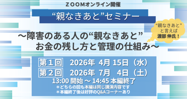 弊社では、2026年4月15日、7月4日に、Zoomオンラインセミナー「障害のある人の“親なきあと” お金の残し方と管理の仕組み」を開催します。