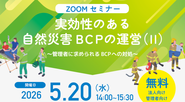 2026年5月20日(水)、弊社では、法人・管理者向けZoomセミナーとして「実効性のある自然災害BCPの運営(Ⅱ)~管理者に求められるBCPへの対処~」を開催いたします。